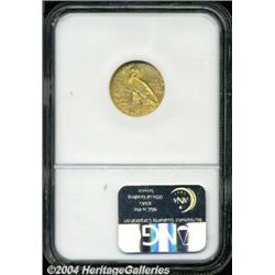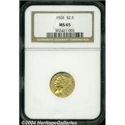 <B>1926<$2 1/2> MS65 NGC.</B></I> This Gem quarter eagle reveals bright orange-gold coloration over lustrous surfaces, with design elements that are exquisitely struck throughout. No bothersome abrasions are apparent on well preserved surfaces. A light tick on the Indian's cheekbone and a couple of more in the left obverse field are mentioned only for accuracy. This most appealing specimen will satisfy the connoisseur of 20th Century United States gold. <BR><BR><B>Important notice:</B> Heritage usually auctions material at the rate of 200-250 lots per hour. On some occasions eBay Live bid software or the Internet may not be able to keep up with the pace of the auction. We recommend placing a realistic absentee bid now as insurance to avoid disappointment. Occasionally the auctioneer may eliminate or reject an eBay Live bid, and the auctioneer may also reopen a lot after the close of the eBay live bidding (usually because we missed an audience bid), and may reject your bid even if it shows you as the winning bidder. By bidding via eBay Live, you agree that Heritage may award the lot to another bidder at its sole discretion under the circumstances described above or any other reasonable circumstances. Since eBay bids are not shown to us until we open the lot on the floor, we treat those bids just like floor bids. In most cases the floor responds before the eBay bid is presented to us, due to Internet lag time, so for consistency we have made it a policy that floor bids are always considered first over tie eBay live bids. Also please note that all Heritage lots purchased through eBay Live carry a 20% Buyer's Premium. Please make sure you read the Terms and Conditions before you bid. </span></font></tr></table></td></tr></table>