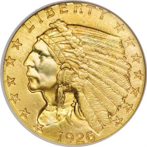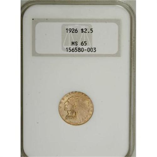 <B>1926 $2 1/2 MS65 NGC.</B></I> This frosty Gem offers marvelous orange-gold and green-gold coloration over the lustrous surfaces. Close perusal under a loupe reveals only tiny ticks and confirms the initial impression of an attractive and boldly struck coin, one of the more available issues from late in the series. NGC has certified only 12 pieces finer (1/08).<BR><BR><B>Coin Engraver:</B> Bela Lyon Pratt<BR><BR><b>Shipping:</b> Coins & Currency (<a target="_blank" href="http://www.heritageauctions.com/common/shipping.php">view shipping information</a>)