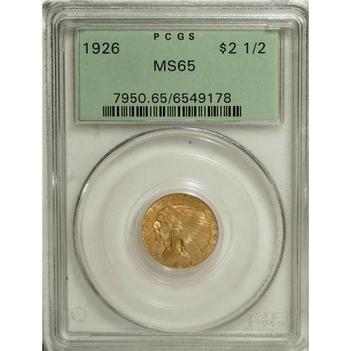 <B>1926 $2 1/2 MS65 PCGS.</B></I> The 1926 is a logical choice for many type collectors. It is a well-produced issue and when found in high grades it is an attractive coin. This is a superlative example whose eye appeal transcends the stated grade. Deep rose-gold color covers each side with lilac interspersing the reddish tinges ever so often. The underlying mint frost is strong and virtually unaffected by the abrasions that usually accompany this design type.<BR><BR><b>Shipping:</b> Coins & Currency (<a target="_blank" href="http://www.heritageauctions.com/common/shipping.php">view shipping information</a>)