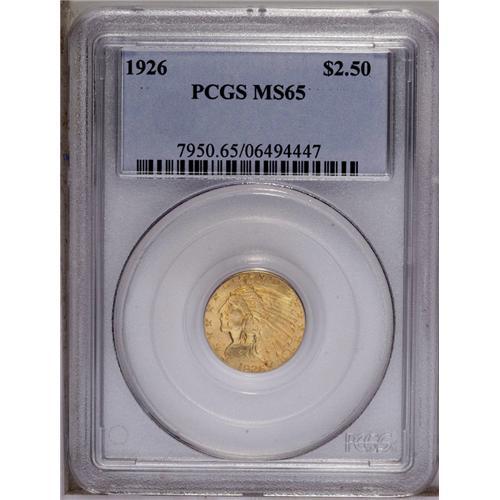 <B>1926<$2 1/2> MS65 PCGS.</B></I> The satiny luster is unbroken on both sides, and the color is a lovely amber-gold with blue-gray tinges in the protected areas and a couple of reddish areas. Robustly struck, and perusal with a loupe reveals only the most trivial, undistracting abrasions. PCGS has graded 36 finer (3/06). <BR><BR><B>Important notice:</B> Heritage usually auctions material at the rate of 200-250 lots per hour. On some occasions eBay Live bid software or the Internet may not be able to keep up with the pace of the auction. We recommend placing a realistic absentee bid now as insurance to avoid disappointment. Occasionally the auctioneer may eliminate or reject an eBay Live bid, and the auctioneer may also reopen a lot after the close of the eBay live bidding (usually because we missed an audience bid), and may reject your bid even if it shows you as the winning bidder. By bidding via eBay Live, you agree that Heritage may award the lot to another bidder at its sole discretion under the circumstances described above or any other reasonable circumstances. Since eBay bids are not shown to us until we open the lot on the floor, we treat those bids just like floor bids. In most cases the floor responds before the eBay bid is presented to us, due to Internet lag time, so for consistency we have made it a policy that floor bids are always considered first over tie eBay live bids. Also please note that all Heritage lots purchased through eBay Live carry a 20% Buyer's Premium. Please make sure you read the Terms and Conditions before you bid. This lot is being auctioned in conjunction with a live floor auction by Heritage Galleries & Auctioneers. All final auction and invoice information will be supplied by Heritage Galleries & Auctioneers, and all other information should be considered preliminary. Lot:2524 <BR><BR><B>Winning Notification and Billing:</B> After the FINAL session in this auction is complete, Heritage will send e-mail and snail mail invoices. This process normally takes several days. All final auction and invoice information will be supplied by Heritage Galleries & Auctioneers, and all other information should be considered preliminary. <BR><BR>This auction will be conducted on a live auction floor and over the Internet through eBay Live. If you choose to place an absentee bid, please take a moment to <font color='#0000ff'><u><a href='http://pages.ebay.com/liveauctions/help/before/laabsentee.html'>learn how eBay Live absentee bidding works</a></u></font><font color='#000000'>