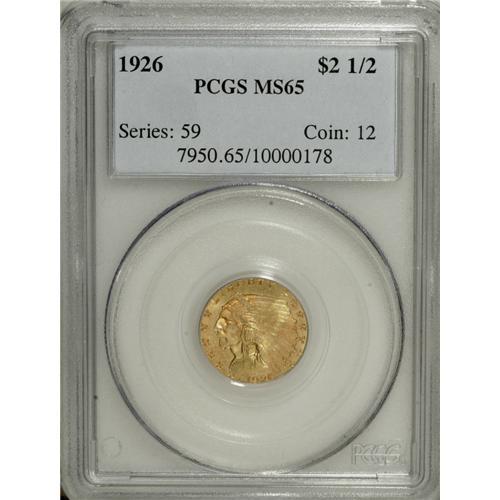 <B>1926 $2 1/2 MS65 PCGS.</B></I> Though the 1920s quarter eagles are seemingly ubiquitous, their mintages are hardly generous, and Gems make up a small fraction of survivors. The emerald-tinged orange-gold surfaces of this piece have only a handful of tiny marks, none of which challenge this coin's grade. Slightly frosty with pleasing definition on the central devices and considerable visual appeal.<BR><BR><b>Shipping:</b> Coins & Currency (<a target="_blank" href="http://www.heritageauctions.com/common/shipping.php">view shipping information</a>)