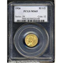 <B>1926<$2 1/2> MS65 PCGS.</B></I> A well struck Gem that has intermingled hues of mint-green and orange-gold color. Both sides have strong cartwheel luster for the issue, which greatly enhances the eye appeal. The surfaces are carefully preserved, although there are a few small contact marks in the reverse field. Indian Quarter Eagles, to an extent greater than any other gold series, are often collected by date and mint rather than type. This adds to the demand for important specimens. <BR><BR><B>Important notice:</B> Heritage usually auctions material at the rate of 200-250 lots per hour. On some occasions eBay Live bid software or the Internet may not be able to keep up with the pace of the auction. We recommend placing a realistic absentee bid now as insurance to avoid disappointment. Occasionally the auctioneer may eliminate or reject an eBay Live bid, and the auctioneer may also reopen a lot after the close of the eBay live bidding (usually because we missed an audience bid), and may reject your bid even if it shows you as the winning bidder. By bidding via eBay Live, you agree that Heritage may award the lot to another bidder at its sole discretion under the circumstances described above or any other reasonable circumstances. Since eBay bids are not shown to us until we open the lot on the floor, we treat those bids just like floor bids. In most cases the floor responds before the eBay bid is presented to us, due to Internet lag time, so for consistency we have made it a policy that floor bids are always considered first over tie eBay live bids. Also please note that all Heritage lots purchased through eBay Live carry a 20% Buyer's Premium. Please make sure you read the Terms and Conditions before you bid. </span></font></tr></table></td></tr></table>