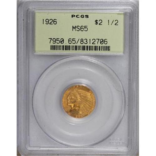 <B>1926 $2 1/2 MS65 PCGS.</B></I> Intensely lustrous with lovely coppery-gold coloration and smooth, well preserved surfaces. The surfaces are nearly pristine, even when closely examined under magnification. This sharply struck Gem is housed in an earlier-generation PCGS holder with a pale yellow-green label. <BR><BR><B>Coin Engraver:</B> Bela Lyon Pratt<BR><BR><b>Shipping:</b> Coins & Currency (<a target="_blank" href="http://www.heritageauctions.com/common/shipping.php">view shipping information</a>\)