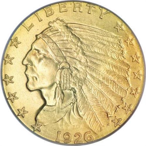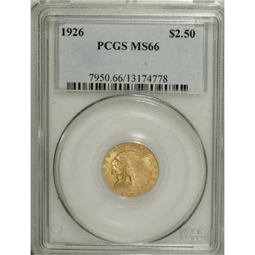 <B>1926 $2 1/2 MS66 PCGS.</B></I> The 1926 Indian Head quarter eagle , with a mintage of 446,000 pieces, is one of the most plentiful of the entire series. This is readily apparent from an inspection of the PCGS/NGC population figures. The two services have certified several thousand examples, with the vast majority falling into the MS62 to MS64 grade ranges. Even MS65 coins can be had without too much difficulty, as close to 1,000 specimens fall into that classification. In the lofty grade of MS66, however, the 1926 is a very challenging coin, with fewer than 50 pieces seen by both services, and none finer.<BR> The apricot-gold surfaces of this Premium Gem display great luster, and are tinted with hints of mint-green. The design features have been the recipient of a powerful strike, with sharp definition seen in the Indian's hair and bonnet feathers and on the eagle's plumage. A small, light alloy spot is noted on the Indian's nose, and light handling marks occur on some of the raised, exposed fields. Population: 37 in 66, 0 finer (11/07).<BR><I>From The Madison Collection.</B></I><BR><BR><B>Coin Engraver:</B> Bela Lyon Pratt<BR><BR><b>Shipping:</b> Coins & Currency (<a target="_blank" href="http://www.heritageauctions.com/common/shipping.php">view shipping information</a>)