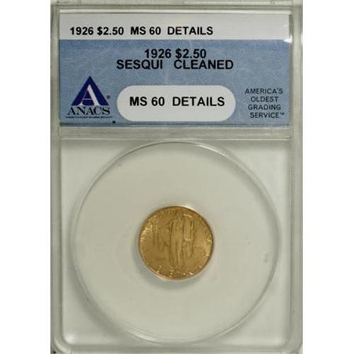 <B>1926 $2 1/2 Sesquicentennial--Cleaned--ANACS. MS60 Details.</B></I> NGC Census: (28/5882). PCGS Population (114/9045). Mintage: 46,019. Numismedia Wsl. Price for NGC/PCGS coin in MS60: $446. (#7466)<BR><BR><b>Shipping:</b> Coins & Currency (<a target="_blank" href="http://www.heritageauctions.com/common/shipping.php">view shipping information</a>)