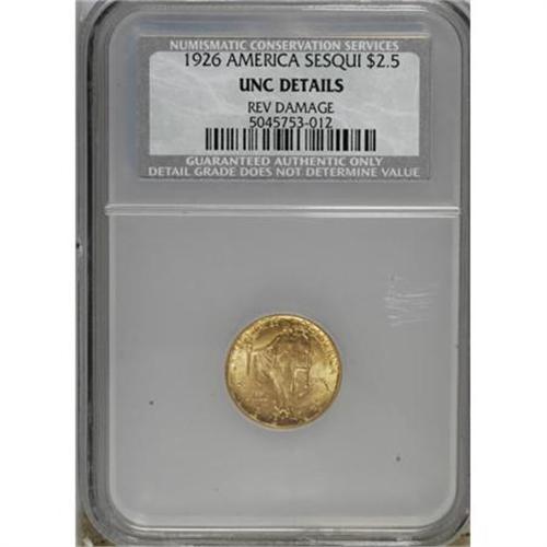 <B>1926 $2 1/2 Sesquicentennial--Reverse Damage--NCS.</B></I> <B>Unc Details.</B></I> NGC Census: (28/6092). PCGS Population (114/9328). Mintage: 46,019. Numismedia Wsl. Price for NGC/PCGS coin in MS60: $446. (#7466)<BR><BR><b>Shipping:</b> Coins & Currency (<a target="_blank" href="http://www.heritageauctions.com/common/shipping.php">view shipping information</a>)