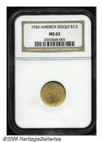 <B>1926<$2 1/2> Sesquicentennial MS62 NGC.</B></I> The satiny surfaces are typically struck, for the issue, and betray a pleasing lustrous sheen, as well as attractive coloration. A few small marks, on each of the two sides, prevent a higher grade assessment from NGC.