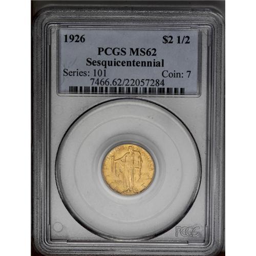 <B>1926<$2 1/2> Sesquicentennial MS62 PCGS.</B></I> A nice orange-gold example with satiny luster and a typical strike. Thin abrasions on either side keep this commemorative from Select status.