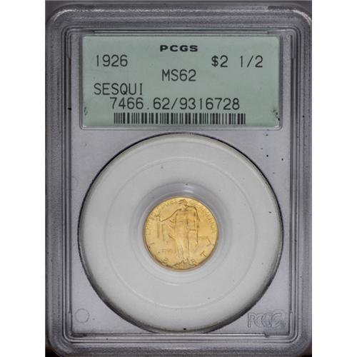 <B>1926<$2 1/2> Sesquicentennial MS62 PCGS.</B></I> Well struck and satiny, with rich golden-orange toning and lustrous, abrasion-free surfaces. A conservatively graded example, housed in a green label holder. <BR><BR><B>Important notice:</B> Heritage usually auctions material at the rate of 200-250 lots per hour. On some occasions eBay Live bid software or the Internet may not be able to keep up with the pace of the auction. We recommend placing a realistic absentee bid now as insurance to avoid disappointment. Occasionally the auctioneer may eliminate or reject an eBay Live bid, and the auctioneer may also reopen a lot after the close of the eBay live bidding (usually because we missed an audience bid), and may reject your bid even if it shows you as the winning bidder. By bidding via eBay Live, you agree that Heritage may award the lot to another bidder at its sole discretion under the circumstances described above or any other reasonable circumstances. Since eBay bids are not shown to us until we open the lot on the floor, we treat those bids just like floor bids. In most cases the floor responds before the eBay bid is presented to us, due to Internet lag time, so for consistency we have made it a policy that floor bids are always considered first over tie eBay live bids. Also please note that all Heritage lots purchased through eBay Live carry a 20% Buyer's Premium. Please make sure you read the Terms and Conditions before you bid. This lot is being auctioned in conjunction with a live floor auction by Heritage Galleries & Auctioneers. All final auction and invoice information will be supplied by Heritage Galleries & Auctioneers, and all other information should be considered preliminary. Lot:5185 <BR><BR><B>Winning Notification and Billing:</B> After the FINAL session in this auction is complete, Heritage will send e-mail and snail mail invoices. This process normally takes several days. All final auction and invoice information will be supplied by Heritage Galleries & Auctioneers, and all other information should be considered preliminary. <BR><BR>This auction will be conducted on a live auction floor and over the Internet through eBay Live. If you choose to place an absentee bid, please take a moment to <font color='#0000ff'><u><a href='http://pages.ebay.com/liveauctions/help/before/laabsentee.html'>learn how eBay Live absentee bidding works</a></u></font><font color='#000000'>
