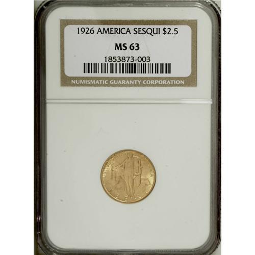 <B>1926 $2 1/2 Sesquicentennial MS63 NGC.</B></I> Apricot-gold luster enlivens both sides of this popular commemorative quarter eagle. The design elements are well impressed, and a few minor ticks prevent a higher grade.<BR><BR><b>Shipping:</b> Coins & Currency (<a target="_blank" href="http://www.heritageauctions.com/common/shipping.php">view shipping information</a>)