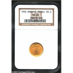 1926 $2 1/2 Sesquicentennial MS63 NGC. Bright and lustrous with a normal strike for the issue and light reverse abrasions. Important notice: We expect to be auctioning lots at the rate of 200-250 per hour. Sometimes eBay Premier live bid software cannot keep up with that pace, so we strongly recommend that you place a realistic proxy bid now as insurance to avoid disappointment. Also please note that all Heritage/CAA lots purchased through eBay Premier carry a 20% Buyer's Premium. Please make sure you read the Terms and Conditions.