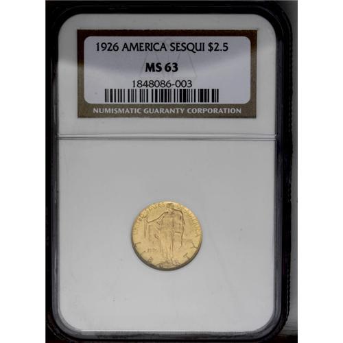 <B>1926<$2 1/2> Sesquicentennial MS63 NGC.</B></I> This Select gold commemorative has smooth, satiny luster paired with a standard strike for the issue. The surfaces are amber with rose undertones.<BR><I>From The Redfjord Collection.</B></I>