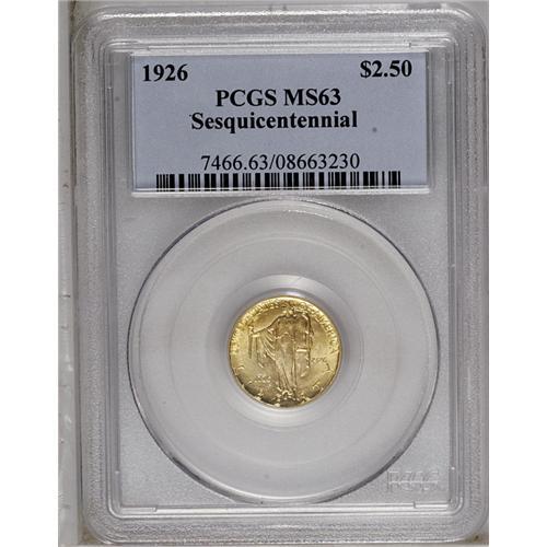 <B>1926<$2 1/2> Sesquicentennial MS63 PCGS.</B></I> A Select straw-gold example with a typical strike. Lustrous with small luster breaks and marks that restrict the grade.