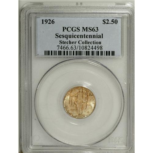<B>1926 $2 1/2 Sesquicentennial MS63 PCGS.</B></I> Boldly struck and highly lustrous, with intermingled mint-green and apricot coloration on both sides. A handful of noticeable blemishes on the obverse define the grade of this Select example. Purchased in the 1930's at face value by Karl Stecher Sr. from coins turned in by the public as per President Roosevelt's March 9, 1933 directive. An old-time envelope marked "1926 2.50 unc Sesquicentennial" is included.<BR><I>From The Stecher Collection.</B></I><BR><BR><b>Shipping:</b> Coins & Currency (<a target="_blank" href="http://www.heritageauctions.com/common/shipping.php">view shipping information</a>)