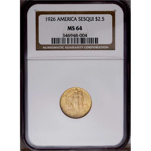 <B>1926<$2 1/2> Sesquicentennial MS64 NGC.</B></I> Boldly struck with glowing luster and subtly variegated rose and green-gold toning. A few small blemishes are seen near the center of the obverse and on the reverse fields.