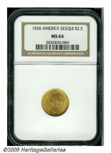 <B>1926<$2 1/2> Sesquicentennial MS64 NGC.</B></I> Fully lustrous and brilliant with frosty yellow gold surfaces and excellent eye appeal. A few tiny abrasions and small copper spots are consistent with the grade.