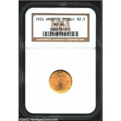 1926 $2 1/2 Sesquicentennial MS64 NGC. Well defined with shimmering mint frost and a small obverse scratch that defines the grade. Important notice: We expect to be auctioning lots at the rate of 200-250 per hour. Sometimes eBay Premier live bid software cannot keep up with that pace, so we strongly recommend that you place a realistic proxy bid now as insurance to avoid disappointment. Also please note that all Heritage/CAA lots purchased through eBay Premier carry a 20% Buyer's Premium. Please make sure you read the Terms and Conditions.