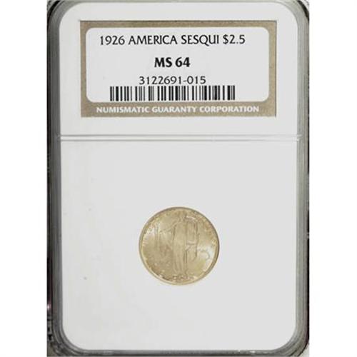<B>1926 $2 1/2 Sesquicentennial MS64 NGC.</B></I> The luster is uncommonly strong on this well-defined Sesquicentennial quarter eagle, which contributes to this coin's excellent eye appeal. Though the wispy flaws in the fields present no individual distractions, they combine to preclude a finer designation.<BR><BR><b>Shipping:</b> Coins & Currency (<a target="_blank" href="http://www.heritageauctions.com/common/shipping.php">view shipping information</a>)