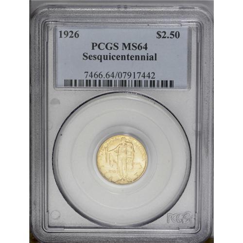 <B>1926<$2 1/2> Sesquicentennial MS64 PCGS.</B></I> A bold and beautiful example of this commemorative quarter eagle. Minor abrasions are visible on both sides of this specimen. The surfaces are brilliant with frosty yellow-gold luster.