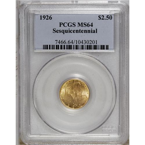 <B>1926 $2 1/2 Sesquicentennial MS64 PCGS.</B></I> A highly lustrous yellow-gold example, somewhat lighter in color than usual for this issue. The strike is adequate, and the fields have just a few scattered marks.<BR><BR><b>Shipping:</b> Coin/Currency (<a target="_blank" href="http://www.heritageauctions.com/common/shipping.php">view shipping information</a>)