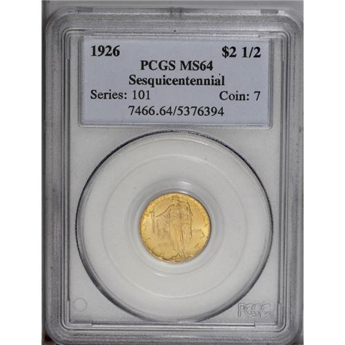 <B>1926<$2 1/2> Sesquicentennial MS64 PCGS.</B></I> A lovely near-Gem, typically struck for this issue with lustrous yellow-orange surfaces. Four small, parallel abrasions on Liberty's right (facing) leg limit the grade.
