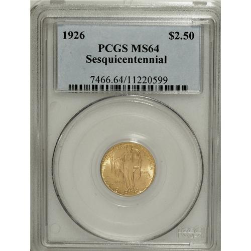 <B>1926 $2 1/2 Sesquicentennial MS64 PCGS.</B></I> A lovely near-Gem representative of this final classic gold commemorative. The shining and slightly frosty wheat-gold surfaces have glints of amber. The light grazes on Liberty's gown are largely inoffensive, though sufficient to deny a higher grade.<BR><BR><b>Shipping:</b> Coins & Currency (<a target="_blank" href="http://www.heritageauctions.com/common/shipping.php">view shipping information</a>)