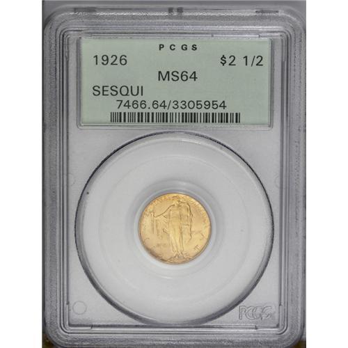<B>1926<$2 1/2> Sesquicentennial MS64 PCGS.</B></I> A satiny near-Gem representative with uniform golden coloration and only the most insignificant frost breaks. Housed in a green label holder.