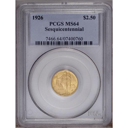 <B>1926<$2 1/2> Sesquicentennial MS64 PCGS.</B></I> An intricately struck, pleasantly preserved, and thoroughly lustrous near-Gem of this final pre-modern gold commemorative.