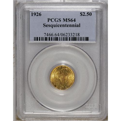 <B>1926 $2 1/2 Sesquicentennial MS64 PCGS.</B></I> An unusually lustrous yellow-gold near-Gem with peach overtones. Nicely struck for this issue with minor, well-distributed marks that preclude Gem status.<BR><BR><b>Shipping:</b> Coin/Currency (<a target="_blank" href="http://www.heritageauctions.com/common/shipping.php">view shipping information</a>)