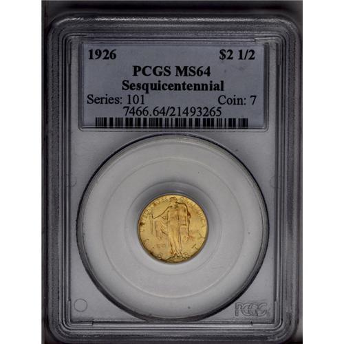 <B>1926<$2 1/2> Sesquicentennial MS64 PCGS.</B></I> Apricot devices complement lime fields. This lustrous near-Gem has a gorgeous reverse, while the obverse has minor contact and a couple of unobtrusive alloy spots.