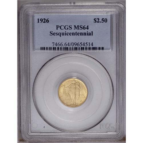 <B>1926<$2 1/2> Sesquicentennial MS64 PCGS.</B></I> Brassy-gold surfaces display adequately struck design features. A few minute marks on each side limit the grade.