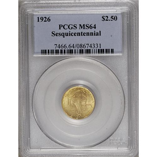 <B>1926 $2 1/2 Sesquicentennial MS64 PCGS.</B></I> A frosty piece that has shimmering luster, though the usual grazes are present on each side. An attractive and solidly graded near-Gem.<BR><BR><b>Shipping:</b> Coin/Currency (<a target="_blank" href="http://www.heritageauctions.com/common/shipping.php">view shipping information</a>)