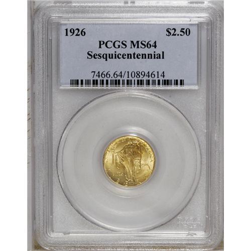 <B>1926 $2 1/2 Sesquicentennial MS64 PCGS.</B></I> Highly lustrous and well struck with light marks on the yellow-gold surfaces that display a splash of apricot in the upper right obverse. A remarkable piece that falls just shy of the elite Gem grade.<BR><BR><b>Shipping:</b> Coins & Currency (<a target="_blank" href="http://www.heritageauctions.com/common/shipping.php">view shipping information</a>)