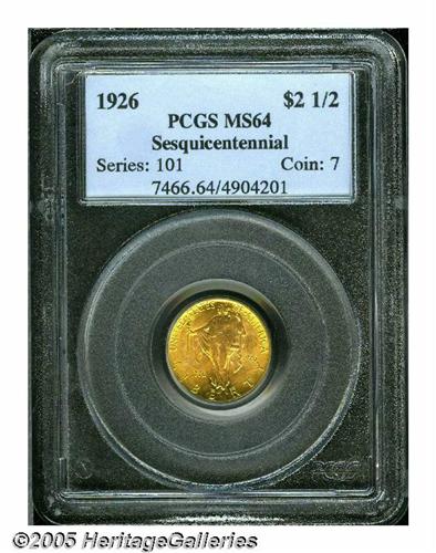 <B>1926<$2 1/2> Sesquicentennial MS64 PCGS.</B></I> Lovely deep honey-red color, attractive luster and just some faint scattered handling marks that prove grade limiting.