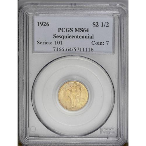 <B>1926<$2 1/2> Sesquicentennial MS64 PCGS.</B></I> Lustrous and typically struck, with lovely peach and mint-green toning and a few tiny contact marks. Very pleasing for the grade.