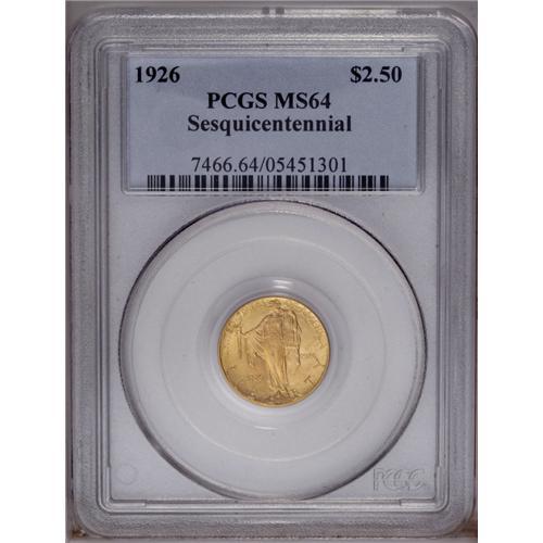 <B>1926<$2 1/2> Sesquicentennial MS64 PCGS.</B></I> Lustrous with a sharp strike and especially pleasing surfaces overall. An attractive commemorative that truly deserves to be called a near-Gem.