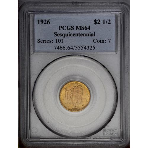<B>1926<$2 1/2> Sesquicentennial MS64 PCGS.</B></I> Peach-gold with tinges of hazel on the highpoints, and a few light scrapes on the lower legs. The obverse rims show glints of greenish-gold, and the reverse shows no notable abrasions. Nice for the near-Gem assessment. <BR><BR><B>Important notice:</B> Heritage usually auctions material at the rate of 200-250 lots per hour. On some occasions eBay Live bid software or the Internet may not be able to keep up with the pace of the auction. We recommend placing a realistic absentee bid now as insurance to avoid disappointment. Occasionally the auctioneer may eliminate or reject an eBay Live bid, and the auctioneer may also reopen a lot after the close of the eBay live bidding (usually because we missed an audience bid), and may reject your bid even if it shows you as the winning bidder. By bidding via eBay Live, you agree that Heritage may award the lot to another bidder at its sole discretion under the circumstances described above or any other reasonable circumstances. Since eBay bids are not shown to us until we open the lot on the floor, we treat those bids just like floor bids. In most cases the floor responds before the eBay bid is presented to us, due to Internet lag time, so for consistency we have made it a policy that floor bids are always considered first over tie eBay live bids. Also please note that all Heritage lots purchased through eBay Live carry a 20% Buyer's Premium. Please make sure you read the Terms and Conditions before you bid. This lot is being auctioned in conjunction with a live floor auction by Heritage Galleries & Auctioneers. All final auction and invoice information will be supplied by Heritage Galleries & Auctioneers, and all other information should be considered preliminary. Lot:5194 <BR><BR><B>Winning Notification and Billing:</B> After the FINAL session in this auction is complete, Heritage will send e-mail and snail mail invoices. This process normally takes several days. All final auction and invoice information will be supplied by Heritage Galleries & Auctioneers, and all other information should be considered preliminary. <BR><BR>This auction will be conducted on a live auction floor and over the Internet through eBay Live. If you choose to place an absentee bid, please take a moment to <font color='#0000ff'><u><a href='http://pages.ebay.com/liveauctions/help/before/laabsentee.html'>learn how eBay Live absentee bidding works</a></u></font><font color='#000000'>