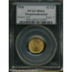 1926 $2 1/2 Sesquicentennial MS64 PCGS. Pretty apr <B>1926 $2 1/2 Sesquicentennial MS64 PCGS.</B></I> Pretty apricot-gold patina bathes lustrous surfaces on each side of this well struck sesqui, and the design features are well defined. A few minor contact marks are not particularly bothersome. <BR><BR><B>Important notice:</B> Heritage usually auctions material at the rate of 200-250 lots per hour. On some occasions eBay Live bid software or the Internet may not be able to keep up with the pace of the auction. We recommend placing a realistic absentee bid now as insurance to avoid disappointment. Occasionally the auctioneer may eliminate or reject an eBay Live bid, and the auctioneer may also reopen a lot after the close of the eBay live bidding (usually because we missed an audience bid), and may reject your bid even if it shows you as the winning bidder. By bidding via eBay Live, you agree that Heritage may award the lot to another bidder at its sole discretion under the circumstances described above or any other reasonable circumstances. Since eBay bids are not shown to us until we open the lot on the floor, we treat those bids just like floor bids. In most cases the floor responds before the eBay bid is presented to us, due to Internet lag time, so for consistency we have made it a policy that floor bids are always considered first over tie eBay live bids. Also please note that all Heritage lots purchased through eBay Live carry a 20% Buyer's Premium. Please make sure you read the Terms and Conditions before you bid. This lot is being auctioned in conjunction with a live floor auction by Heritage Galleries & Auctioneers. All final auction and invoice information will be supplied by Heritage Galleries & Auctioneers, and all other information should be considered preliminary. Lot:7990