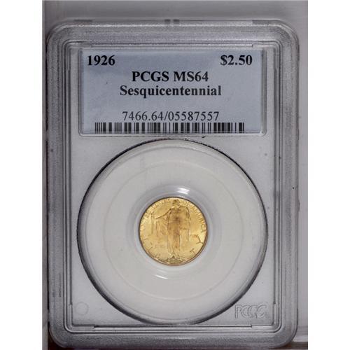 <B>1926<$2 1/2> Sesquicentennial MS64 PCGS.</B></I> Shades of peach and orange-gold and lime-green bathe highly lustrous surfaces that display sharply struck design elements. A few minor handling marks over each side define the grade.<BR><I>From The Larj Collection.</B></I>