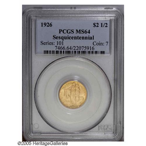 <B>1926<$2 1/2> Sesquicentennial MS64 PCGS.</B></I> Sharply struck with bright, satiny surfaces that are lightly toned and have just two or three tiny nicks that prevent the Gem grade assessment. A sparkling, eye pleasing near-Gem.