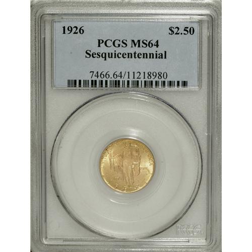 <B>1926 $2 1/2 Sesquicentennial MS64 PCGS.</B></I> The bright, frosted surfaces are mostly yellow-gold with just the slightest hint of red intermixed. Minimally abraded.<BR><BR><b>Shipping:</b> Coins & Currency (<a target="_blank" href="http://www.heritageauctions.com/common/shipping.php">view shipping information</a>)
