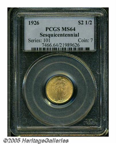 <B>1926<$2 1/2> Sesquicentennial MS64 PCGS.</B></I> The design features are sharply impressed on this commemorative gold piece, and the lustrous surfaces display yellowish-gold patina around the peripheries, and a more apricot-gold color in the centers. A few grade-defining marks are scattered about.