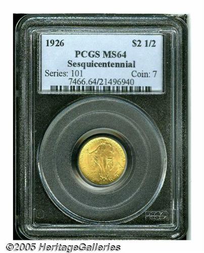<B>1926<$2 1/2> Sesquicentennial MS64 PCGS.</B></I> The soft, frosted mint luster is only noticeably disturbed on the reverse. Even golden-orange coloration is seen throughout.