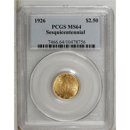 <B>1926<$2 1/2> Sesquicentennial MS64 PCGS.</B></I> This wheat-gold near-Gem sports an above-average strike and pretty luster. The surfaces have just a few too many marks to qualify for a higher grade.