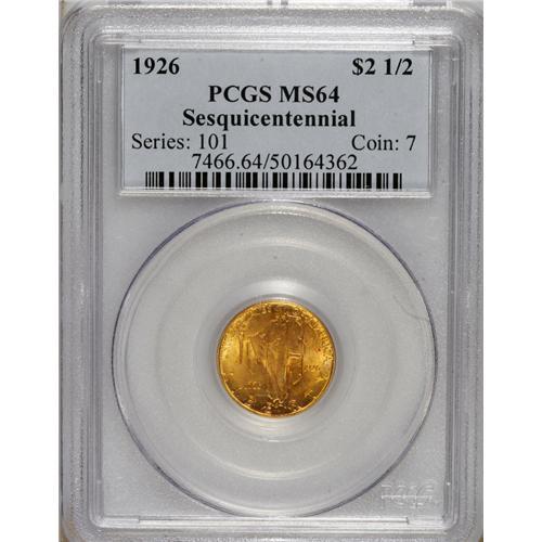 <B>1926 $2 1/2 Sesquicentennial MS64 PCGS.</B></I> Though John R. Sinnock had a distinguished career as an engraver, this was the only gold issue he ever designed. The rich butter-yellow surfaces have distinctly rose-orange centers. The luster and strike are strong, though a fingerprint and copper spot appear in the right obverse field.<BR><BR><b>Shipping:</b> Coins & Currency (<a target="_blank" href="http://www.heritageauctions.com/common/shipping.php">view shipping information</a>)