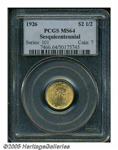 <B>1926<$2 1/2> Sesquicentennial MS64 PCGS.</B></I> Typically struck with lovely orange-gold toning, gleaming satiny luster, a few faint marks, and a small alloy spot or two overall. An attractive near-Gem example.
