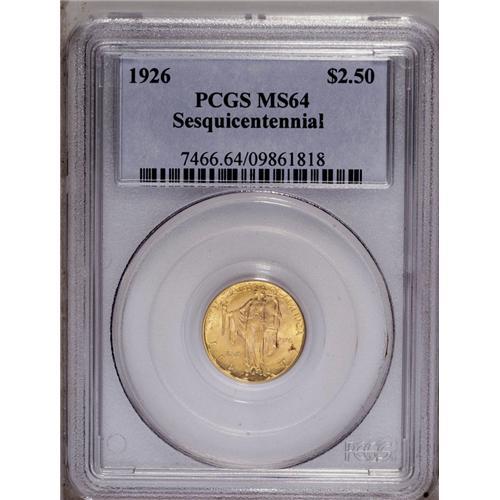 <B>1926<$2 1/2> Sesquicentennial MS64 PCGS.</B></I> Free of appreciable marks, displaying an overlay of yellow-gold patina over either side. A couple of small alloy spots are noted on the obverse.