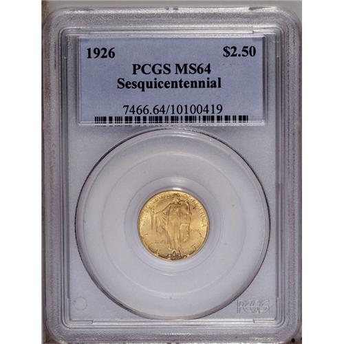 <B>1926<$2 1/2> Sesquicentennial MS64 PCGS.</B></I> A delightful example of this issue in near-Gem condition. The surfaces are fully lustrous with lovely yellow-gold coloration.