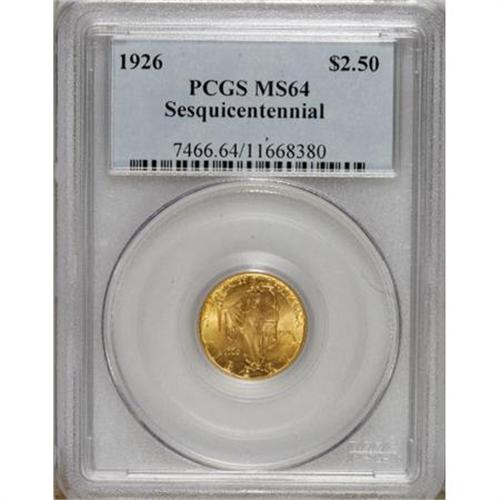 <B>1926 $2 1/2 Sesquicentennial MS64 PCGS.</B></I> Lustrous, as always, with no mentionable marks on either side. There is a curious feature on this piece that we have not noticed on other examples: The peripheral lettering was apparently punched into the die with too much force, creating an extra outline around each letter.<BR><BR><b>Shipping:</b> Coins & Currency (<a target="_blank" href="http://www.heritageauctions.com/common/shipping.php">view shipping information</a>)