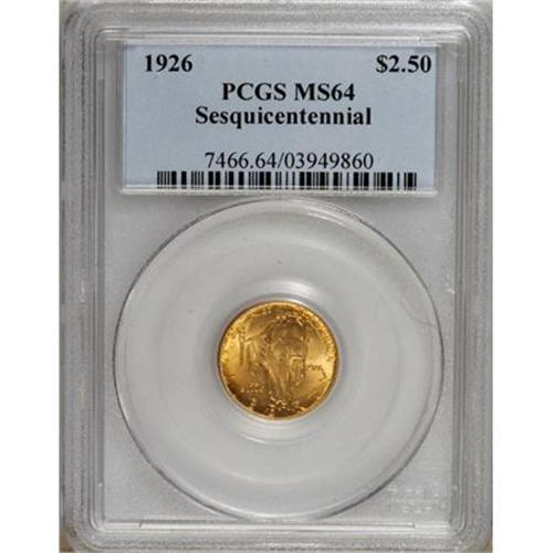 <B>1926 $2 1/2 Sesquicentennial MS64 PCGS.</B></I> Boldly struck with shimmering luster and lovely uniform orange-gold color. A handful of obverse marks prevent a higher grade. From a mintage of 46,019 pieces. Liberty holds a scroll representing the Declaration of Independence, and the Philadelphia Independence Hall is depicted on the reverse.<BR><BR><b>Shipping:</b> Coins & Currency (<a target="_blank" href="http://www.heritageauctions.com/common/shipping.php">view shipping information</a>)